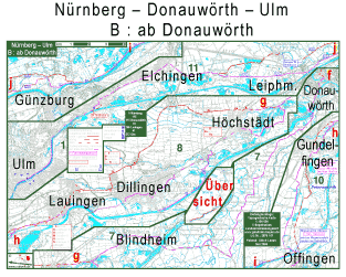Auf dem Fahrrad Nürnberg nach Donauwörth, Augsburg und Ulm: Die Route überquert zwar zwei Wasserscheiden, aber nur ein Gebirge. Grund sind die günstigenTalverläufe der sich in F¨rth zur Regnitz vereinenden Flüsse. Die am Südrand von Nürnberg fließende Rednitz entsteht in Georgensgmünd aus derfränkischen und der Schwäbischen Rezat. Der flussaufwärts folgend gelangt man durch Pleinfeld, Ellingen und Weißenburg zur kontinentalen Talwasserscheide bei Graben. Hier wurde unter Karl dem Großen der erste Versuch gemacht, einen Main-Donau-Kanal zu bauen, die Fossa Carolina. Von Treuchtlingen aus folgt man dem selben Tal in die Fränkische Alb, wie die Bahnlinie NürnbergAugsburg. Da es von der Alb nach Donauwörth keine geeigneten Nebenstraßen gibt, ist der teilweise mehrere 100 m von der Straße entfernte durchgehend asfaltierte Radweg der B2 sehr hilfreich. In Donauwörth gabelt sich die Route: Der Zweig nach Augsburg wird in zwei Varianten empfohlen: Die Route am Hügelfuß (Biberbach Gablingen) vermeidet Städte, hat aber hier und da eine kleine Steigung. Die Route mehr mitten im Lechtal vermeidet fast jegliche Steigung, füHrt aber durch größere Orte wie Meitingen und die Stadt Gersthofen. Der Radwanderweg "Romantische Straße" ist fast auf ganzer Länge geschottert und daher hur für den Nahbereich von Augsburg zu empfehlen immerwieder durch Baustellen unterbrochen. Der Zweig nach Ulm hat ebenfalls zwei Varianten. Von denen ist allerdings bisher erst die südliche (durch Riedheim) zusammenh”ngend als Karte dargestellt. Die nördliche (Karte siehe auch Regensburg Stuttgart, Blatt B, Felder 8 und 9 und Würzburg Ulm, Blatt B, Felder 11 und 12) ist 1 km k&uul;rzer und schotterfrei, zusammenhängend aber nur als Track verfügbar. Beide folgen auf manchen Abschnitten dem Donau-Radwanderweg. Für einige der Umwege und Schotterstrecken des Radwanderwegs wurden bessere Alternativen gesucht und abgefahren, besonders von Höchstädt nördlich an Dilingen vorbei nach Lauingen. Zum Vergleich wurden schon in der Landkarte als ungünstig erkennbare Abschnitte des Donauradwegs auch ohne Test mit dargestellt. Besonders geeignete sind im Wechsel in den Signaturfarben für Empfehlung und für Wegweisung dargestellt. In Gundelfingen gibt es eine Stadtplantafel für Radfahrer, die zwar die Bundesstraße und den Radwanderweg zeigt, andere zum Radfahren wichtige Straßen aber leugnet. Die Wegweisung in Offingen hat die Qualität von Wegelagerei: Nahe dem rechten Donau-Ufer beginnt der besser zum Vorankommen geeignete Zweig auf dem Uferdamm, der den eigentlichne Ort nicht berührt. Das Wegweiserschild dafür ("Ulm über Günzburg") ist zwar ziemlich groß, befindet sich aber nicht an dem Pfahl mit den anderen Wegweisern, sondern auf einer Stellwand mit mehreren ausführlichen Schautafeln, die nicht liest, wer schnell nach Ulm will. | ||||